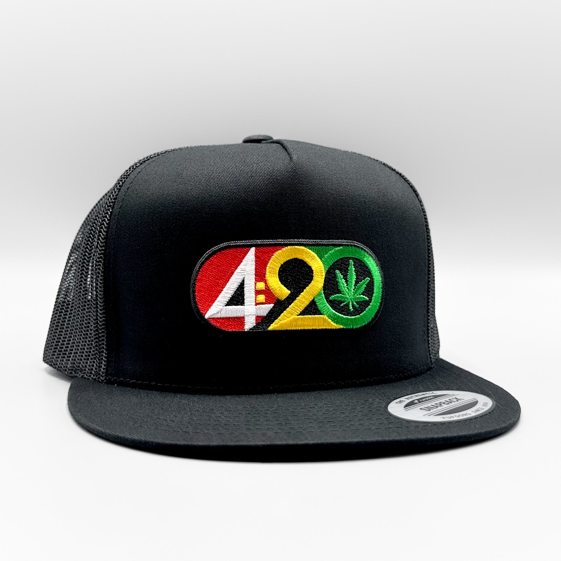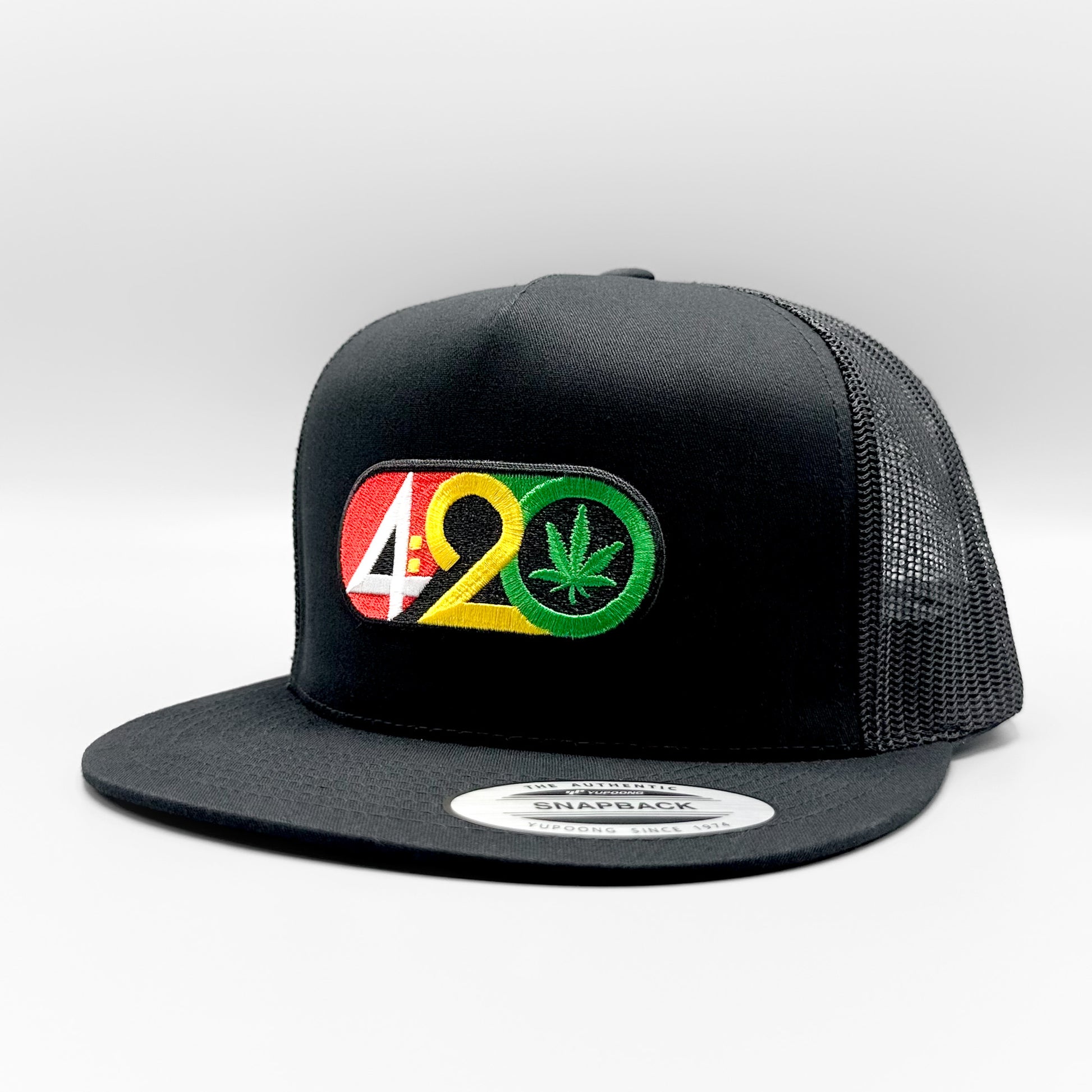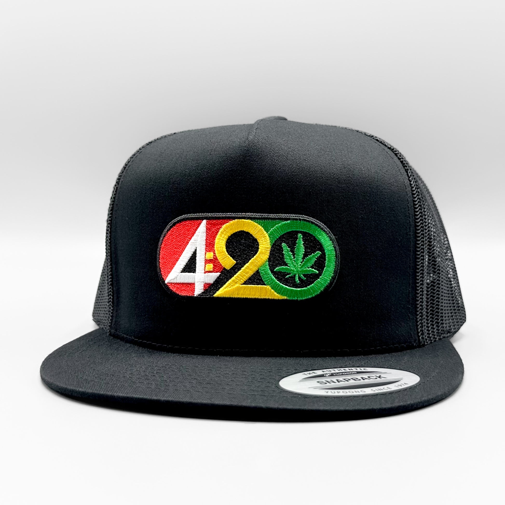This retro 420 Marijuana trucker hat features rasta colored red, green and yellow marijuana leaf embroidered patch on an all black, premium Yupoong 6006 Classic high-crown mesh snapback baseball cap. If your favorite kind of weed doesn't grow in a yard, this is the hat for you!