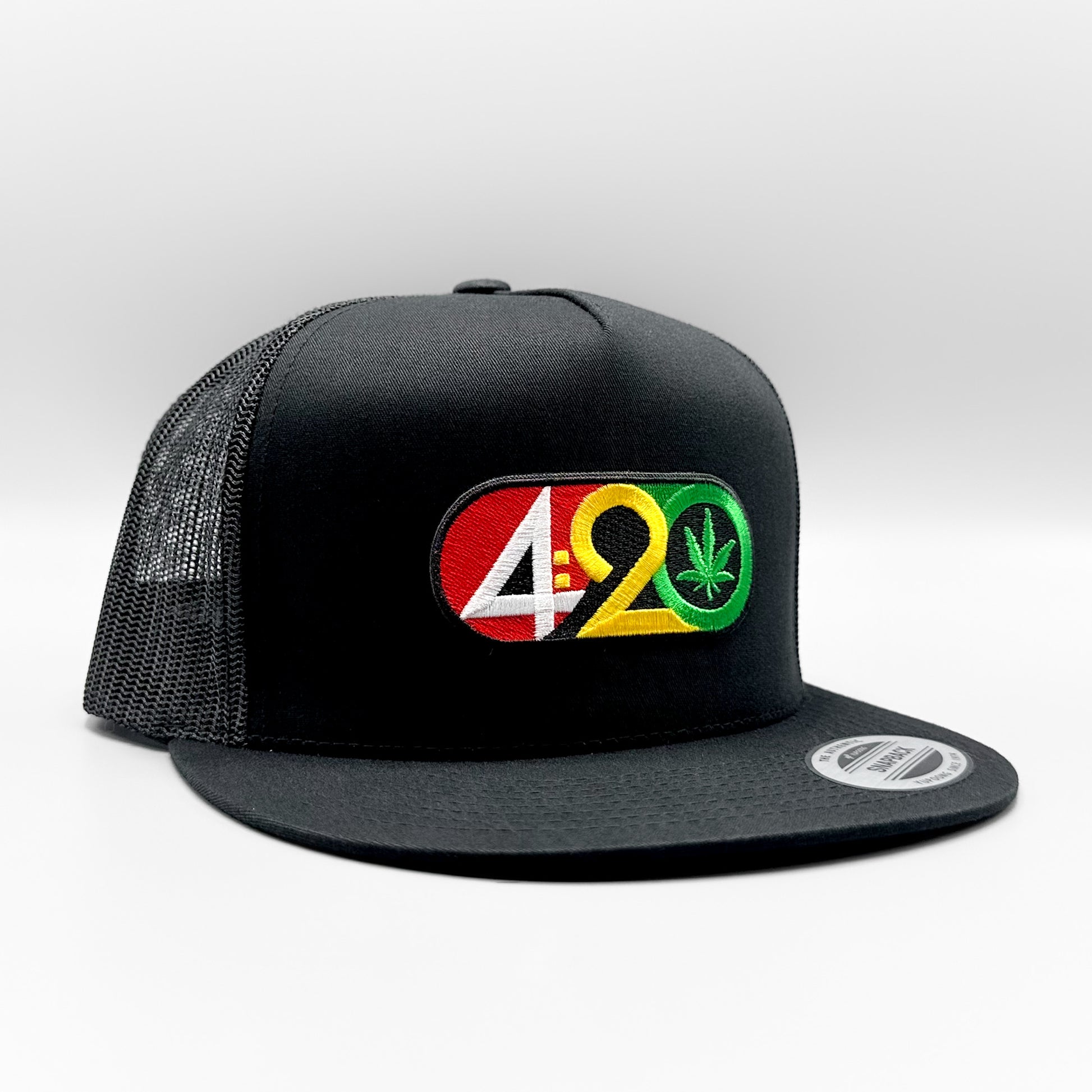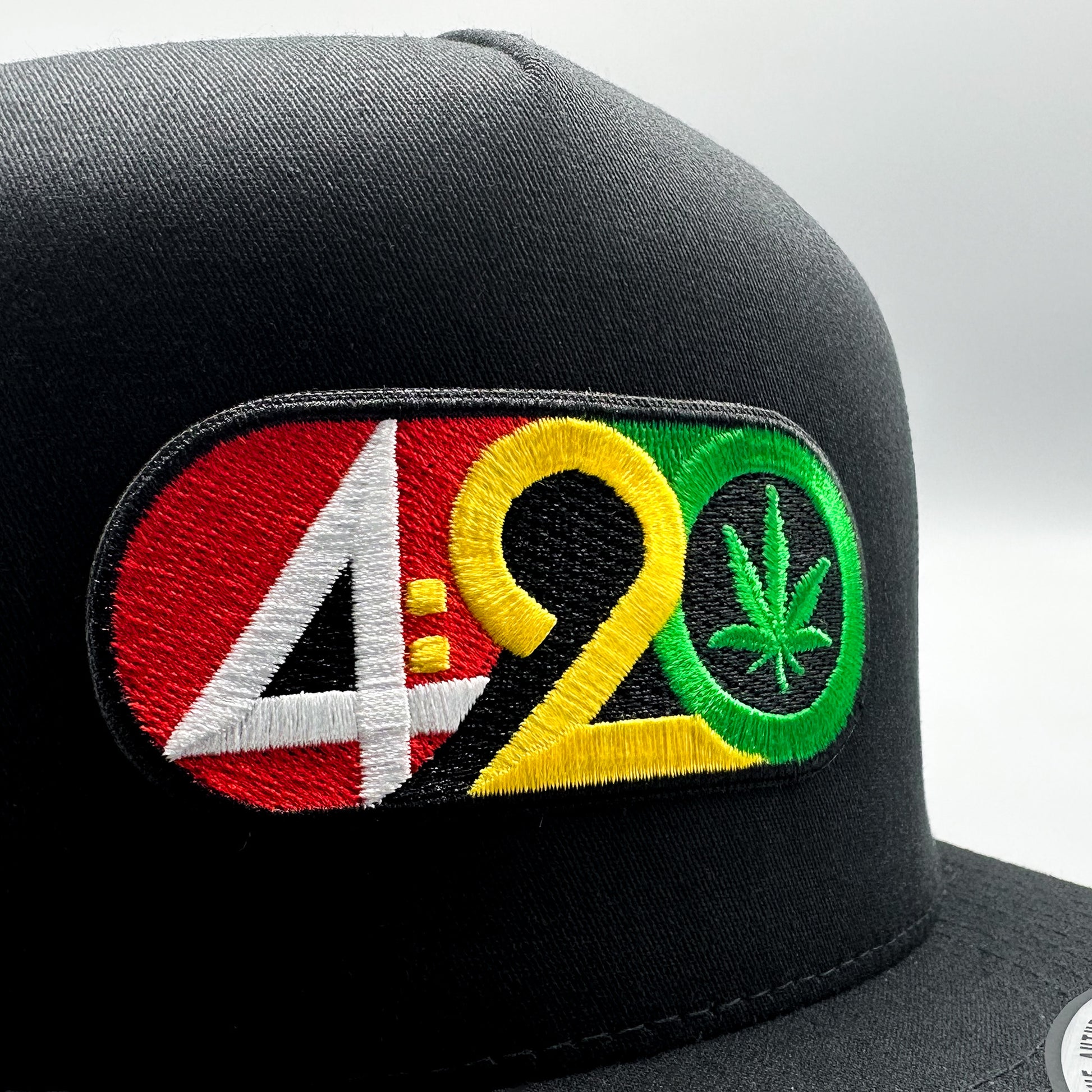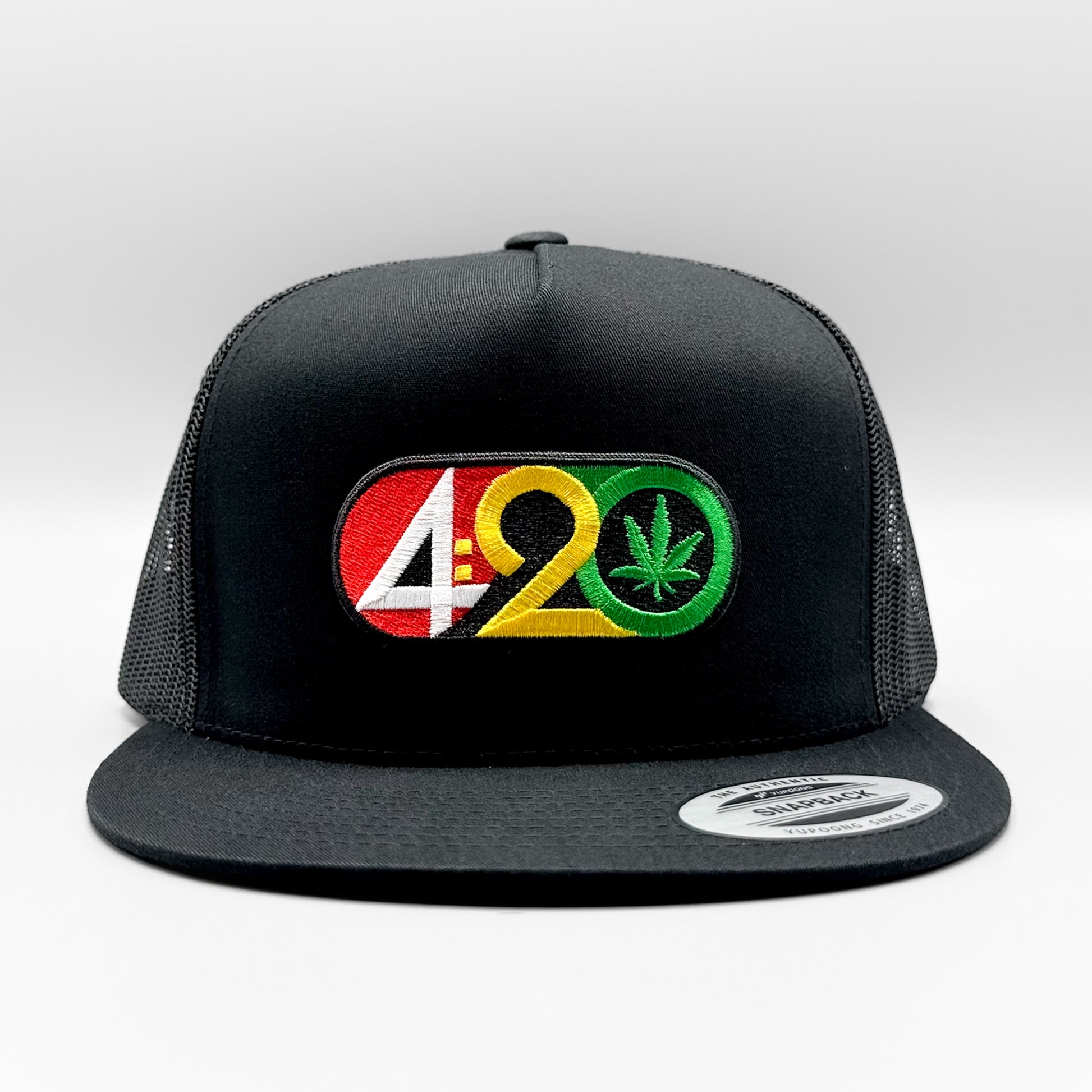 This retro 420 Marijuana trucker hat features rasta colored red, green and yellow marijuana leaf embroidered patch on an all black, premium Yupoong 6006 Classic high-crown mesh snapback baseball cap. If your favorite kind of weed doesn't grow in a yard, this is the hat for you!