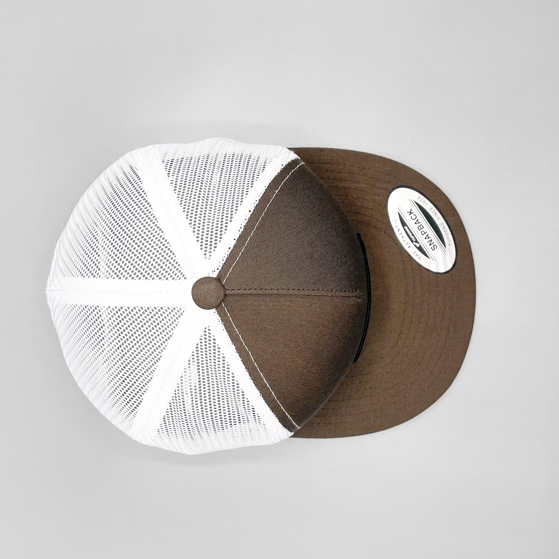 This trucker features an embroidered Square Body logo patch on a new Yupoong 6006 Classic mesh snapback brown and white mesh snapback trucker hat.