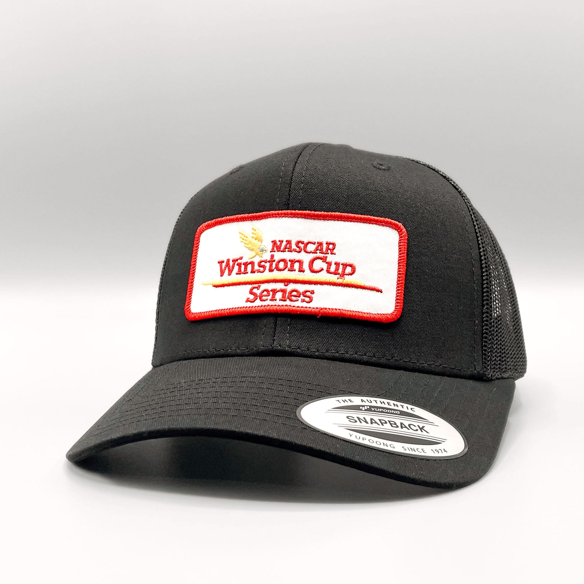 Baseball style black curved bill trucker hat with retro Nascar Winston Cup Series embroidered patch on a mid-crown, standard fit Yupoong 6606 six-panel snapback mesh baseball cap.