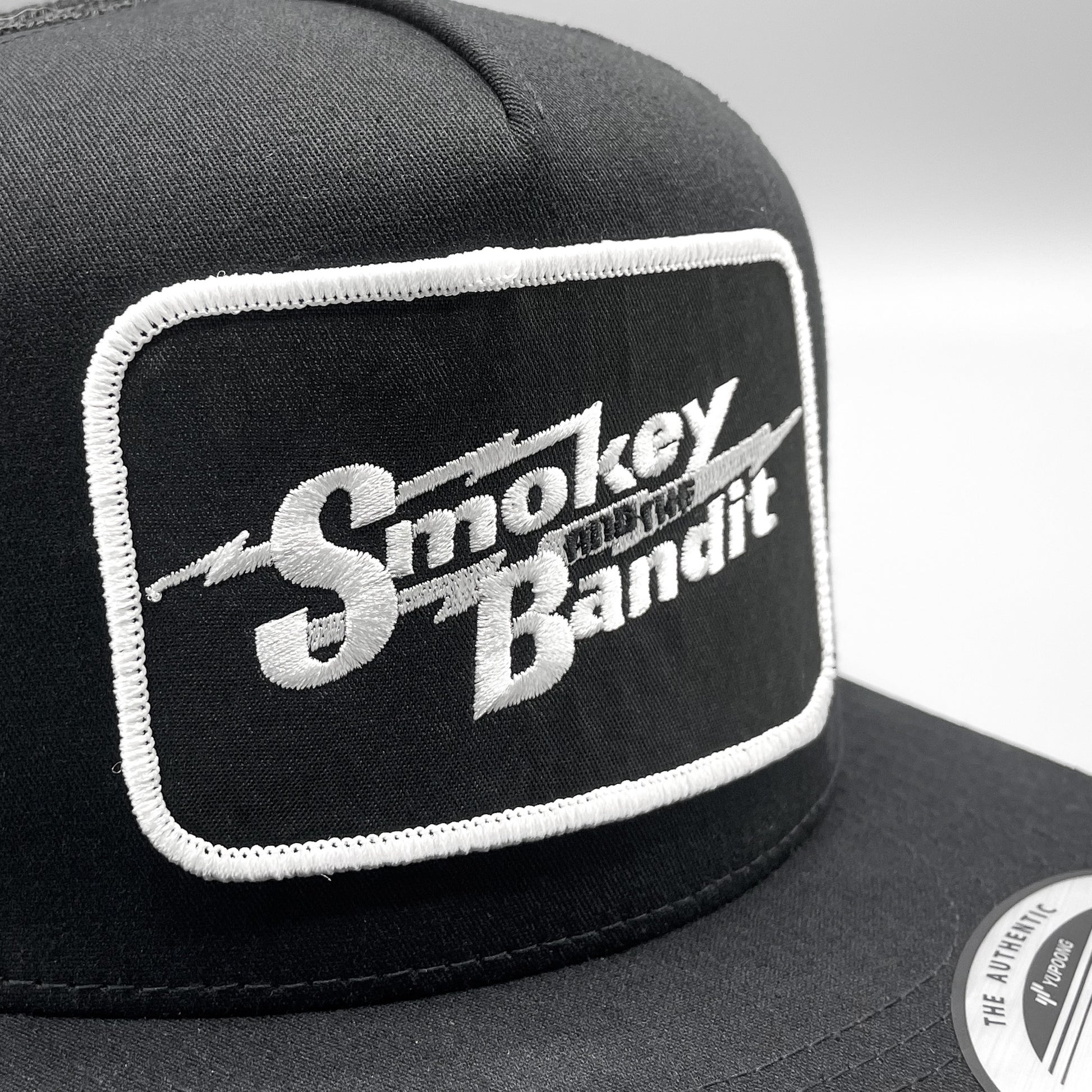 Retro, Embroidered Smokey and the Bandit embroidered patch on an all black Yupoong 6006 mesh snapback hat.